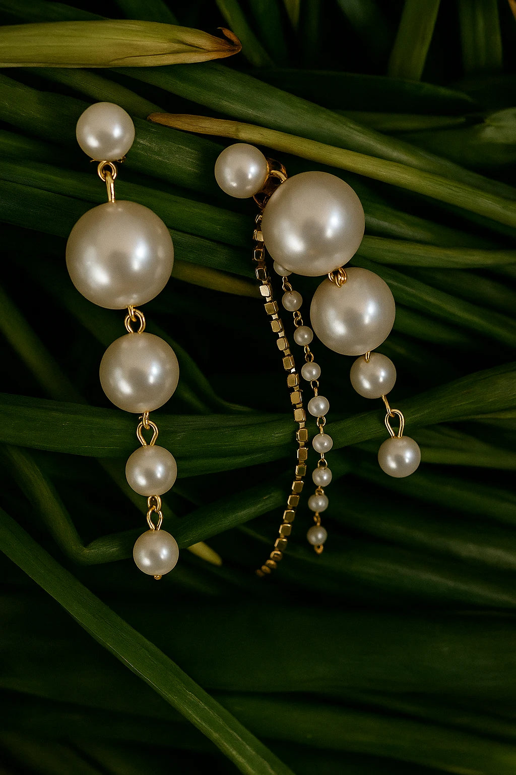 Radiate timeless charm with these layered pearl drop earrings, featuring cascading faux pearls in various sizes and a delicate gold-plated chain. A perfect balance of classic elegance and modern design — ideal for parties, weddings, or sophisticated everyday looks.