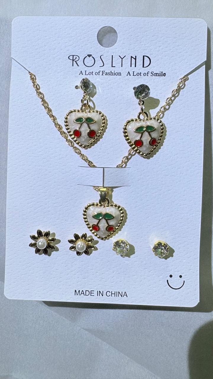 A cute and charming jewelry set featuring glittery white heart charms decorated with red cherries and green leaves. This Elyviya combo includes matching cherry heart drop earrings, a cherry heart pendant necklace, and extra flower-pearled studs and crystal studs. Playful, pretty, and perfect for everyday fashion or gifting.